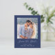 Este simples e minimalista Cartão Salvar a Data contém uma foto quadrada acima das palavras "Salvar a Data" no elegante guião branco, seguido pelos nomes do casal, data do casamento e cidade em sans serif em um fundo azul marinho. Adicione uma mensagem mais detalhada com informações adicionais sobre o inverso, juntamente com um código QR para ajudar seus convidados a visitar seu site de casamento.