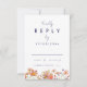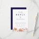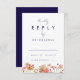Este elegante e romântico cartão de marinho RSVP de casamento outono azul de flor silvestre é projetado para complementar qualquer um dos convites para casamentos outono de flor silvestre. Apresentando uma mistura harmoniosa de matizes autóctones como laranja queimada, terracota, coral, número queimado, amarelo, laranja, pêssego e verduras de terra, essa carta captura a essência de uma celebração de outono. As delicadas flores silvestres pintadas manualmente evocando o calor e o encanto da estação. O fundo azul e branco marinho confere elegância, enquanto os florais brancos em tons de laranja queimado, número queimado, coral, amarelo, roxo e rosa trazem um toque de beleza da natureza para o design. A elegante escrita caprichosa e a tipografia moderna infundem a carta com sofisticação, fazer a forma perfeita de convidar os vossos convidados a partilhar no vosso dia especial. Projetada pela artista Catherine Sweetman, esta placa RSVP mantém a sensação acolhedora e íntima de uma celebração inspirada em boho enquanto fornece um formato fácil de personalizar para seus convidados responderem. O design de eterno e as cores convidativas garantem que este cartão é o companheiro perfeito para o seu convite de casamento, oferecendo um toque caloroso e sincero ao seu evento.