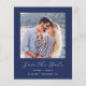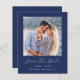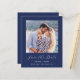 Este simples e minimalista Cartão Salvar a Data contém uma foto quadrada acima das palavras "Salvar a Data" no elegante guião branco, seguido pelos nomes do casal, data do casamento e cidade em sans serif em um fundo azul marinho. Adicione uma mensagem mais detalhada com informações adicionais sobre o contrário.