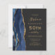 A borda esquerda deste elegante e moderno convite de aniversário 50º apresenta uma marinho azul de aquarela agata borda aparada com brilho dourado. O texto personalizável combina manuscrito dourado, fontes em copperplate e itálico em um fundo preto de slate. O verso apresenta um design azul-marinho e um agate-ouro correspondentes.