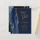A borda esquerda deste elegante casamento moderno salve o cartão de data apresenta uma marinho azul de aquarela agata borda aparada com falso brilho dourado. O texto personalizável combina manuscrito dourado, fontes em copperplate e itálico em um fundo azul marinho. O verso apresenta um design azul-marinho e um agate-ouro correspondentes.