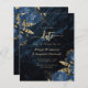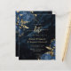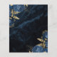 Este elegante casamento salve o cartão de data com buquês florais azuis marinhos disparados com verde folha de ouro em dois cantos, em uma imagem de fundo do agate azul marinho. O texto personalizável combina fontes de serifa, itálico e escrita manual douradas. O verso apresenta um marinho azul- e ouro floral e design agate correspondentes.