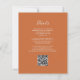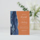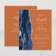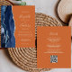 A borda esquerda deste elegante convite de casamento moderno apresenta um marinho azul de aquarela agata bordada com falso brilho prateado. O texto personalizável combina manuscritos, placas de impressão e fontes itálicas em cinzas prateadas leves em um fundo laranja. O verso fornece espaço para detalhes do casamento em um fundo laranja sólido, junto com um código QR que os convidados podem digitalizar para visitar seu site e RSVP, o que economiza o custo de imprimir e enviar RSVP separados