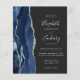 A borda esquerda deste elegante convite de casamento moderno apresenta um marinho azul de aquarela agata bordada com falso brilho prateado. O texto personalizável combina manuscritos, placas de impressão e fontes itálicas em cinzas prateadas claras em um fundo de cinza de carvão negro. O verso apresenta um design azul marinho e agate prateado correspondentes.