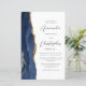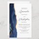 A borda esquerda deste elegante convite de casamento moderno apresenta um marinho azul de aquarela agata borda aparada com falso brilho dourado. O texto personalizável combina o script de cinza de carvão e as fontes sans serif em um fundo branco. O verso fornece espaço para detalhes do casamento em um fundo branco sólido, junto com um código QR que os convidados podem digitalizar para visitar seu site e RSVP, o que economiza o custo de imprimir e enviar cartões RSVP separados.