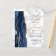 A borda esquerda deste elegante convite de casamento moderno apresenta um marinho azul de aquarela agata borda aparada com falso brilho dourado. O texto personalizável combina manuscrito dourado com fontes em preto e em itálico em um fundo branco e em mármore de cinza. O verso fornece espaço para detalhes do casamento em um fundo de mármore, junto com um código QR que os convidados podem digitalizar para visitar seu site e RSVP, o que economiza o custo de imprimir e enviar cartões RSVP separados.