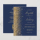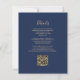 A borda esquerda deste elegante convite de casamento moderno apresenta uma borda falsa de ouro. O texto personalizável combina manuscrito dourado, fontes em copperplate e itálico em um fundo azul marinho. O verso fornece espaço para detalhes do casamento em um fundo azul de marinho sólido, junto com um código QR que os convidados podem digitalizar para visitar seu site e RSVP, o que economiza o custo de imprimir e enviar cartões RSVP separados.