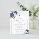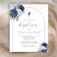 Este elegante convite para batismo apresenta uma forma de arco branco esboçado com uma fina linha azul marinho sobre um fundo branco, flanqueado em dois cantos por um par de buquês florais azuis empoeirados e azuis marinho com folhagem prateada. Um terceiro buquê, menor, aparece numa cruz de folha de alumínio prateada, acima das palavras "por favor, junte-se a nós para o batismo do nosso filho" em elegante marinho azul caligrafia e cinzas de carvão em itálico. Personalize-o com o nome no script azul do marinho e os detalhes na fonte serif da cinza. Uma aspersão de folha de papel fina prateada confunde o bordo superior da placa. O verso é branco sólido.