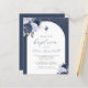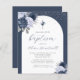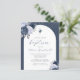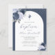 Este elegante convite para batismo apresenta uma forma de arco branco sobre um fundo azul marinho, flanqueado em dois cantos por um par de buquês florais azuis e azuis marinhos com folhagem prateada. Um terceiro buquê, menor, aparece numa cruz de folha de alumínio prateada, acima das palavras "por favor, junte-se a nós para o batismo do nosso filho" em elegante marinho azul caligrafia e cinzas de carvão em itálico. Personalize-o com o nome no script azul e os detalhes na fonte de sans da cinza. Uma aspersão de folha de papel fina prateada confunde o bordo superior da placa. O verso é azul marinho sólido.