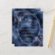 Este elegante menu de casamento moderno apresenta uma moldura geométrica prateada decorada com buquês florais marinho azuis e prateados num fundo de folha azul marinho. O texto personalizável combina a escrita manual imétrica de cinzas prateadas, a placa de cobre e as fontes itálicas.
