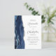 A borda esquerda deste elegante convite de casamento moderno apresenta um marinho azul de aquarela agata bordada com falso brilho prateado. O texto personalizável combina o script de cinza de carvão e as fontes sans serif em um fundo branco. O verso fornece espaço para detalhes do casamento em um fundo branco sólido, junto com um código QR que os convidados podem digitalizar para visitar seu site e RSVP, o que economiza o custo de imprimir e enviar cartões RSVP separados.