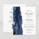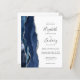 A borda esquerda deste elegante convite de casamento moderno apresenta um marinho azul de aquarela agata bordada com falso brilho prateado. O texto personalizável combina manuscrito, copperplate e fontes itálicas em cinzas de carvão em um fundo branco. Adicione mais detalhes no verso, juntamente com um código QR para ajudar seus convidados a visitar seu site de casamento.