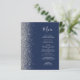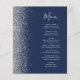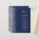A borda esquerda deste elegante menu de casamento moderno apresenta uma borda cintilante de prata. O texto personalizável combina o script de escrita manual de cinzas prateadas e as fontes em um fundo azul marinho. O verso apresenta um design marinho azul e prateado correspondente.