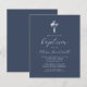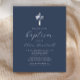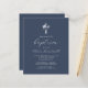 Este elegante convite batismo apresenta um buquê de aquarela de flores azuis e marinhos poeirentas e folhagem prateada numa cruz de folha de alumínio prateada, acima das palavras "junte-se a nós para o batismo do nosso filho" em elegante caligrafia branca e itálico num fundo azul marinho. Personalize-o com o nome no script branco e os detalhes na fonte sans serif. A parte traseira da placa é azul marinho estável. Ideal para o batismo de um menino.