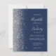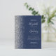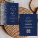 A borda esquerda deste elegante convite de casamento moderno apresenta uma borda falsa de prata. O texto personalizável combina a escrita manual de cinzas prateadas, fontes copperplate e itálico em um fundo azul marinho. Adicione mais detalhes no verso, juntamente com um código QR para ajudar seus convidados a visitar seu site de casamento.