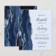A borda esquerda deste elegante convite de casamento moderno apresenta um marinho azul de aquarela agata bordada com falso brilho prateado. O texto personalizável combina letra de escrita manual, placa de impressão e fontes itálicas em azul marinho sobre fundo azul pálido. O verso apresenta um design azul marinho e agate prateado correspondentes.