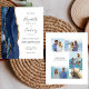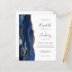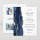 A borda esquerda deste elegante convite de casamento moderno apresenta um marinho azul de aquarela agata borda aparada com falso brilho dourado. O texto personalizável combina a escrita manual de cinzas de carvão, as fontes em copperplate e itálico em um fundo branco. O verso fornece espaços para 4 fotos (1 quadrado, 2 horizontais, 1 vertical longo) e espaço para o seu site de casamento URL ou outras informações.