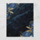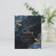 Este elegante convite para o casamento apresenta buquês florais azuis saltados com verde folha de ouro em dois cantos, em uma imagem de fundo de agate de cor azul marinho. O texto personalizável combina fontes de serifa, itálico e escrita manual douradas. O verso apresenta um marinho azul- e ouro floral e design agate correspondentes.