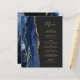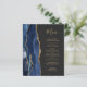 A borda esquerda deste elegante cardápio moderno de casamento apresenta uma marinho azul de aquarela agata bordada com falso brilho dourado. O texto personalizável combina o script de escrita manual dourado e as fontes de impressão em um plano de fundo off-black. O verso apresenta um design azul-marinho e um agate-ouro correspondentes.