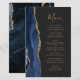 A borda esquerda deste elegante cardápio moderno de casamento apresenta uma marinho azul de aquarela agata bordada com falso brilho dourado. O texto personalizável combina o script de escrita manual dourado e as fontes de impressão em um plano de fundo off-black. O verso apresenta um design azul-marinho e um agate-ouro correspondentes.