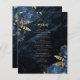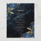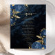 Este elegante menu de casamento apresenta buquês florais azuis marinhos disparados com verde folha de alumínio dourada em dois cantos, numa imagem de fundo de agate azul marinho. O texto personalizável combina fontes de serifa e escrita manual de cor dourada. O verso apresenta um marinho azul- e ouro floral e design agate correspondentes.