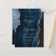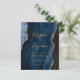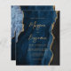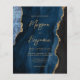Este elegante convite de casamento apresenta uma imagem de fundo da marinho azul de aquarela agada com falso brilho dourado. O texto personalizável combina manuscrito, protetor e fontes itálicas de cor dourada. O verso fornece espaço para detalhes do casamento em um fundo de agate azul marinho correspondente, juntamente com um código QR que os convidados podem digitalizar para visitar seu site e RSVP, o que economiza o custo de imprimir e enviar cartões RSVP separados.
