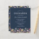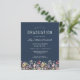 Uma bela borda floral de aquarela de flores silvestres decora a borda inferior deste convite de festa de formatura de vassouras. Personalize o texto branco em um fundo azul marinho com o nome do formando em script de escrita manual; o ano escolar e de classe em sans serif; e os detalhes de data, local e RSVP em fonte serif. A parte de trás do cartão apresenta um padrão de coordenação de flores silvestres num fundo azul marinho.