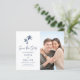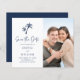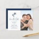 Este elegante marinho para o casamento da praia tropical azul BUDGET salve o cartão de data com duas palmeiras acima do texto, guião de caligrafia para o anúncio "Salvar a Data" e uma foto do casal feliz.