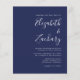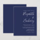 Este simples convite de casamento moderno apresenta um texto branco sobre um fundo azul marinho. Adicione os nomes da noiva e do noivo na caligrafia de escrita manual do na moda e os detalhes na fonte sans serif. O reverso é uma sombra correspondente de azul marinho sólido.