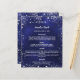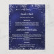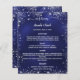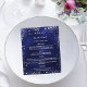 Um clássico cardápio de casamento. Um fundo azul marinho, decorado com faxes cintilantes prateados. A cor azul é irregular. Texto branco. Personalize e adicione seu nome, data e menu. Você pode adicionar mais texto, fotos no verso. 1 folha = 1 menu impresso borda a borda.