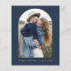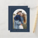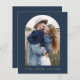 Marinho de casamento do orçamento Azul e Cartões salve a data Dourados que têm uma foto na frente. Os Cartões salve a data contêm uma moderna tipografia cursiva escrita escrita escrita escrita escrita escrita escrita escrita que é elegante, simples e moderna a ser usada depois da simples celebração do dia de casamento minimalista.