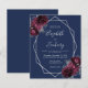 Este elegante convite de casamento moderno apresenta um quadro geométrico de prata decorado com flores de burgundy e prata num fundo azul marinho. O texto personalizável combina a escrita manual imétrica de cinzas prateadas, a placa de cobre e as fontes itálicas. O verso é azul marinho sólido.