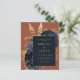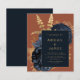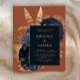 Este elegante e modesto convite para o casamento apresenta um buquê floral romântico, luxuoso, em azul marinho, com folha de ouro e folhagem brilhante num fundo laranja ferrugem ou queimado. Personalize o texto dourado em fontes na moda em um retângulo azul escuro. O verso é azul escuro sólido.
