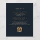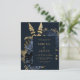 Este elegante e meloso convite de casamento apresenta um buquê floral romântico e luxuoso em azul marinho com folha de ouro e folhagem brilhante num fundo escuro. Personalize o texto dourado em fontes na moda em um retângulo escuro. O verso fornece espaço para detalhes do casamento em um fundo sólido, junto com um código QR que os convidados podem digitalizar para visitar seu site e RSVP, o que economiza o custo de imprimir e enviar cartões RSVP separados.