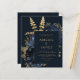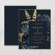 Este elegante e meloso convite de casamento apresenta um buquê floral romântico e luxuoso em azul marinho com folha de ouro e folhagem brilhante num fundo azul escuro. Personalize o texto dourado em fontes na moda em um retângulo escuro. O verso é azul escuro sólido.