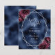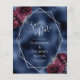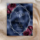 Este elegante casamento moderno salva o cartão de data apresenta uma estrutura geométrica prateada decorada com buquês florais de burgundy e prata em um fundo azul marinho de folha azul. O texto personalizável combina a escrita manual imétrica de cinzas prateadas, a placa de cobre e as fontes itálicas.