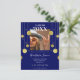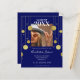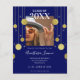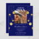 Obtenha qualidade e acessibilidade com este convite de formatura moderno. O design apresenta uma borda parcial de embelezamentos de ouro retrorados contra um fundo azul marinho. Todos os detalhes podem ser personalizados, assim como adicionar em sua própria foto do formando especial em sua vida.