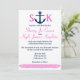 Um convite temático náutico do casamento no marinho e no rosa. Uma âncora está na parte superior do convite, com as iniciais dos noivos de cada lado. Na parte inferior é um rosa design trançado colorido da corda. A parte traseira é um rosa contínuo com uma âncora do marinho no canto.