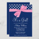 Um convite para chá de fraldas na moda cor-de-rosa e marinho azul. Apresentando bolinhas brancas e um gráfico de arco rosa. Perfeito para um chá de fraldas de menina. Um papinho e uma gracinha. Personalize facilmente a sua festa! Designs são ilustrações/gráficos impressos em formato plano - NÃO É VERDADEIRO.