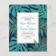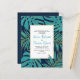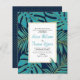 BUDGET teal, marinho azul e monstera tropical dourada e palmeira folhas de palma convite de casamento com código QR para RSVP online. Mostra um padrão de folhas tropicais em azul-lacrimogêneo com contorno de ouro em azul-marinho e seu texto em branco. O verso inclui um padrão de bolinhas dourado sobre o fundo do marinho e o código QR.