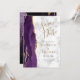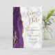 Este elegante casamento moderno salve o cartão de data com uma cor d'água púrpura e borda agitada com falso brilho dourado. O texto personalizável combina o script dourado com a fonte em chapa impressa preto e dourado em uma cinza e fundo de mármore branco. O verso apresenta um design de agate roxo e dourado correspondente.