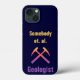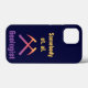 Capa de telefone azul escura com martelos de rocha cruzados e dois campos de texto editáveis em gradiente laranja a roxo. Personalize na página do produto com qualquer string de texto.
