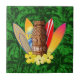 A máscara havaiana de Tiki com alguns prancha retros e hibiscus amarelo do vintage floresce, a flor de estado de Havaí.