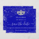 Um cartão de datilografia e moda Salve a data para uma festa de aniversário de 50 anos (ou qualquer idade). Um fundo azul real decorado com pó falso prateado brilhante e uma máscara de mascarada. Personalize e adicione uma data e nome/idade. O texto: Salvar a Data é gravado com um script de estilo com letra de tendência grande.