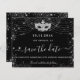 Um cartão de datilografia e moda Salve a data para uma festa de aniversário de 50 anos (ou qualquer idade). Um fundo preto clássico decorado com faxes cintilantes prateados e uma máscara de mascarada. Personalize e adicione uma data e nome/idade. O texto: Salvar a Data é gravado com um script de estilo com letra de tendência grande.