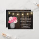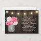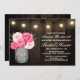Mason Jar + Peony Rustic Convites de chá de panela - design apresenta um fundo de madeira de celeiro com luzes de cordas no topo com um buquê de pedras dentro a mason jar com a palavra amor impressa em uma letra elegante.