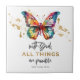 Uma linda Borboleta em Aquarela com detalhes em dourado e o versículo de Mateus 19:26 da bíblia "Com Deus, todas as coisas são possíveis" azulejo de cerâmica