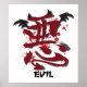 Mau Kanji Poster. Este é o símbolo kanji japonês para mau, e é escrito como "aku" em inglês. Nas histórias japonesas, e em outras literaturas, este símbolo é usado para descrever algo extremamente escuro e sinistro. O kanji para a mau tem um olhar muito distinto, mas adicionei uma cauda, asas escuras e chifres pontiagudos para que fosse mais reconhecível à primeira vista.