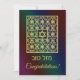 Todo o texto neste cartão é totalmente personalizável para se adequar à sua mensagem e ocasião especiais. A placa apresenta a palavra "Parabéns" em inglês e hebraico e uma estrela de David em uma moldura de damasco dourado em fundo arco-íris profundo. A parte de trás do cartão é embelezada com ornamentos de caligrafia floral.