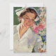 Ilustração antiga de ciência e imagem empresarial. Design de cuidados de saúde com uma enfermeira sorridente em uniforme com um chapéu. Ela está segurando um copo de água para um paciente na cama do hospital para ajudá-lo a se recuperar. Um lindo buquê de flores de primavera em um vaso. Homeopatia como método alternativo para cura e obtenção de saúde.